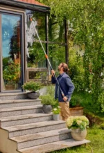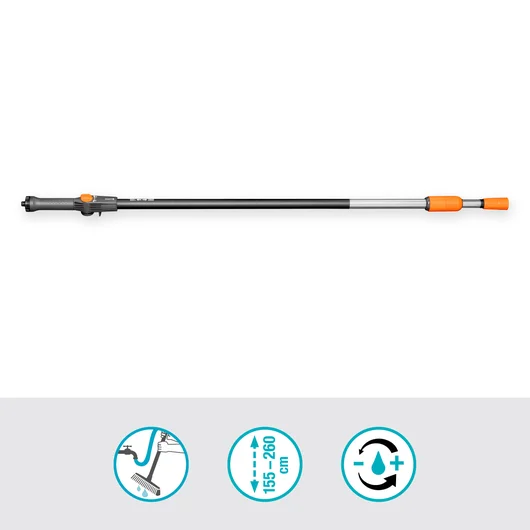 სახელურის სიგრძე რეგულირდება 155-დან 260 სმ-მდე, რაც საშუალებას გაძლევთ კომფორტულად და უსაფრთხოდ გაწმინდოთ თუნდაც სათბურები, აივნის მინა ან სახურავები კიბის გარეშე. წყალმომარაგება რეგულირდება სახელურზე განთავსებული ვენტილით, რაც მარტივად გაძლევთ საჭირო წნევისა და ნაკადის შერჩევის საშუალებას.