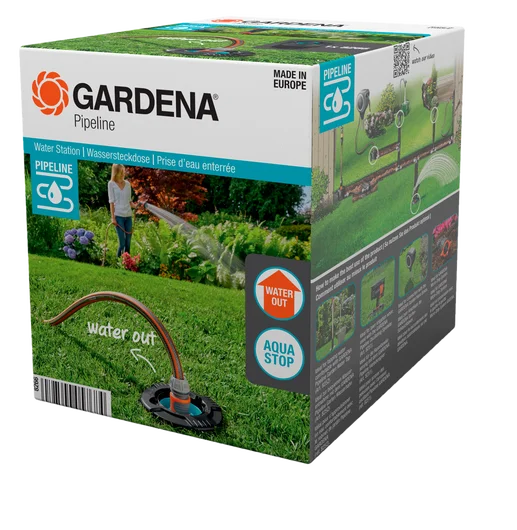 GARDENA Water Station არის მორწყვის წყაროს წერტილი ბაღისთვის, რომელიც მუდმივად მიწის ქვეშ არის დამონტაჟებული და საშუალებას გაძლევთ მარტივად დააკავშიროთ მილი იქ, სადაც ყველაზე მეტად გჭირდებათ წყალი; მას აქვს ჩაშენებული სარქველი, რომელიც წყლის დინებას უშვებს მხოლოდ მაშინ, როცა მილი სრულად არის შეერთებული, ხოლო მოხსნისას ავტომატურად აჩერებს ნაკადს, ხოლო ჩაშენებული ფილტრი მარტივად იწმინდება, რაც ხდის მას გამძლე, საიმედო და იდეალურ კომპონენტად GARDENA Pipeline სისტემისთვის.
