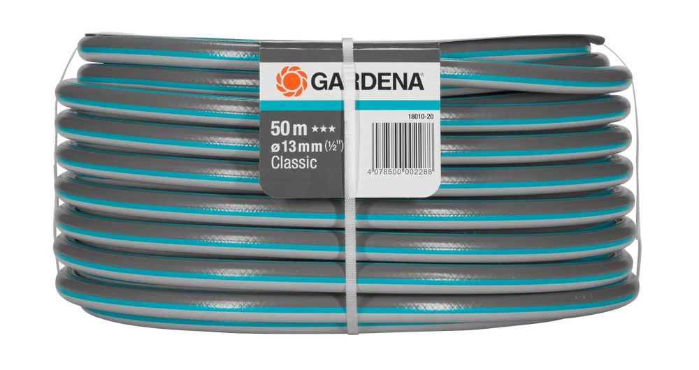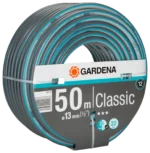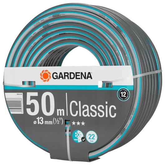 GARDENA Classic შლანგი 13 მმ (1/2″) დიამეტრით და 50 მ სიგრძით გამოირჩევა სტაბილური ფორმითა და მოქნილობით. მისი ელასტიურობა ხელს უშლის გადახვევასა და გადახლართვას მცენარეთა მორწყვისა ან წმენდის დროს. UV და ყინვაგამძლეა, რაც საშუალებას აძლევს გარეთ მთელი წლის განმავლობაში დარჩეს. გამძლეა 22 ბარ წნევამდე. არ შეიცავს მავნე ნივთიერებებს — ფთალატების, კადმიუმის, ტყვიისა და ბარიუმის შემცველობა <0.1%-ია.