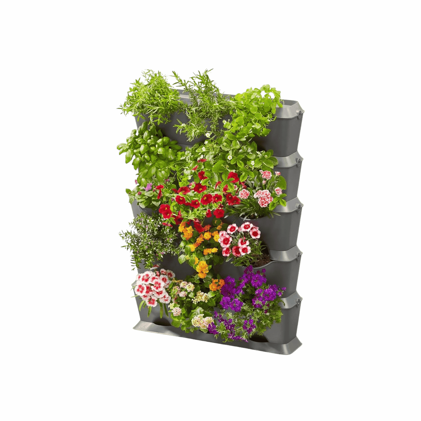 GARDENA NatureUp! Vertical Set – მოქნილი და მარტივად გაფართოებადი სისტემა საშუალებას გაძლევთ სწრაფად და ძალისხმევის გარეშე გაამწვანოთ კედლები ყვავილებით, ბოსტნეულითა და სურნელოვანი მცენარეებით. ამინდისადმი მდგრადი პლასტმასის ქოთნები მარტივად ერთდება ერთმანეთზე სიძნელეების გარეშე და შესაძლებელია როგორც კედელზე დამაგრება, ასევე იატაკზე მოთავსება. თითოეულ ქოთანში ინტეგრირებული დრენაჟი იცავს ზედმეტი ტენის დაგროვებას, ხოლო ჭარბი წყალი გროვდება იატაკის ძირის სინში – ამით კედელი და იატაკი სუფთა რჩება.